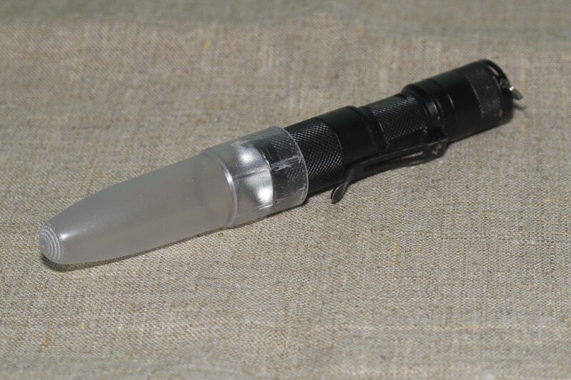 В качестве диффузора использовал с небольшой доработкой футляр от фотопленки. Самодельный диффузор мне нравится больше, свет более ровный. При этом фениксовский, по диаметру чуть меньше чем фонарик, пришлось обработать рашпилем ))), а самодельный подгоняется под любой диаметр.