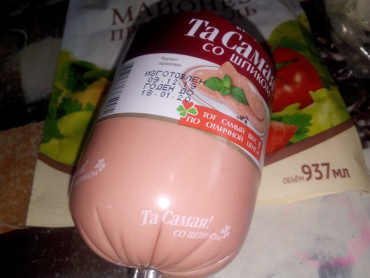 Друзья, последнее время я часто вижу вывески типа "Тот самый вкус" или "Как в СССР" или "Любимое с детства". Производители все чаще и чаще пытаются "сыграть" на тех вкусовых ощущениях, которые вы запомнили и полюбили еще в те времена, когда в колбасу не добавляли заменители и ароматизаторы, когда мороженное делали из молока и сливок, а не из пальмового масла, когда чай был чаем, а не пылью с чайного производства... И вот на одну такую колбасы я нарвалась в Магните... Все по правилам...название "Та самая, со шпиком" производитель "Фамильные колбасы". Колбаса продавалась по акции и стоила где то около 50 р за маленький батон (где то 300 гр) На фото видно, что упаковка расписана и разрисована по всем правилам маркетинга...типа ТА САМАЯ, ТОТ САМЫЙ... Вот так выглядит эта колбаса в разрезе. Конечно же в составе из мяса, одни намеки на него. Много химии и различных растительных жиров (хотя бы честно написано). А на вкус...скажем так, на колбасу времен СССР не похоже совсем. Есть сильный чесн
