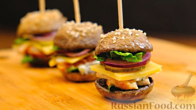Продукты: На 4 мини-бургера: Шампиньоны (среднего размера) - 8 шт. Куриное филе - 100 г Огурец маринованный - 0,5 шт. Сыр твёрдый - 20 г Лук репчатый - 0,5 шт. Соевый соус - 3 ст. л. Чеснок - 1 зубчик Масло растительное - 2 ст. л. Кунжут - 2 г Сахар - 2 щепотки Соль - 1 щепотка Уксус яблочный - 1 ст. л. Салатные листья - 1 шт. *Для соуса тартар: Йогурт густой - 1 ст. л. Огурец маринованный - 0,5 шт. Укроп измельчённый - 1 ст. л. Сахар - 1 щепотка Соль - по вкусу Перец чёрный молотый - по вкусу Как приготовить закусочные "бургеры" из шампиньонов: Шляпки шампиньонов очищаем от кожицы. Ножки грибов не понадобятся, их можно использовать в другом рецепте. Для маринада натираем на тёрке чеснок. Смешиваем чеснок с соевым соусом и растительным маслом. По желанию и по вкусу маринад можно досолить. Маринуем куриное филе в 1 ст. л. ложке полученного маринада. В остальном маринаде маринуем очищенные шляпки шампиньонов. Оставляем грибы мариноваться минимум на 30 минут. Лук нарезаем тонкими к