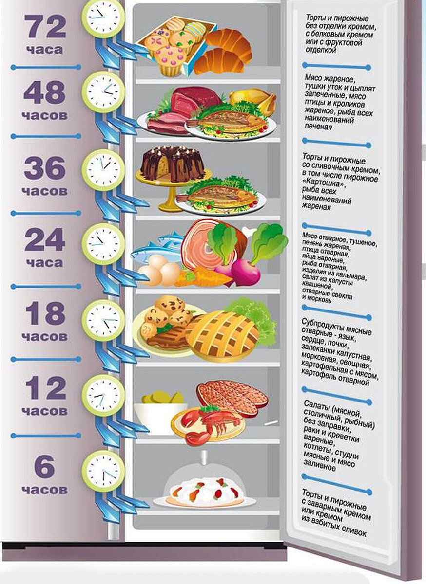 Знаете ли вы, сколько им и другим продуктам с новогоднего стола положено «жить» в холодильнике, чтобы остаться безопасными для здоровья? Утром вы с ужасом обнаружили, сколько же всего не съедено... Не бойтесь, не такой уж это ужас-ужас. На самом деле, готовая еда может храниться довольно долго. Конечно, не все новогодние каникулы, но все же и не несколько часов. Есть продукты, которые бактерии любят особенно: соусы, тушеное мясо, салаты, моллюски, блюда из яиц со сливками, мясные супы и фарши. Санитарные нормы и правила, которые были приняты еще в СССР, но по-прежнему в ходу, уверяют нас, что чем меньше срок хранения, тем лучше (см. инфографику). Эти правила нормируют самый минимальный срок хранения. Этот срок и берется за точку «невозврата». А теперь давайте разбираться, что поможет продлить жизнь нафаршированной утке и остаткам оливье. Всё так?