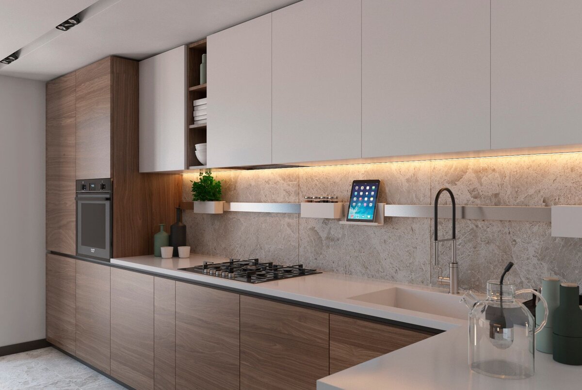 Чем масштабнее размеры кухни, тем сложнее организовать пространство. Характерное для большой кухни деление на зоны упрощает ситуацию, но без грамотного проекта воплотить в жизнь идеи дизайна невозможно. Важно определиться со стилем, подобрать подходящие оттенки отделки и мебели, учесть сочетаемость материалов и другие нюансы. Обычно площадь в несколько квадратных метров делят на зоны и получают отдельную обеденную зону, гостиную и место для приготовления пищи. Но полагаться только на габариты кухонного помещения не стоит, нужно чтобы каждая деталь соответствовала выбранному стилю и находилась на своем месте. Зонирование считается самым сложным в организации пространства комнат и кухни в просторном доме. Неправильный подход к обустройству кухонь более 20 квадратных метров приводит к захламлению, а чрезмерный минимализм - к потере полезной площади. Важно максимально точно определить место обеденной и рабочей области кухни. Дизайнеры прибегают к хитростям в зонировании кухни. Нужно: Прав