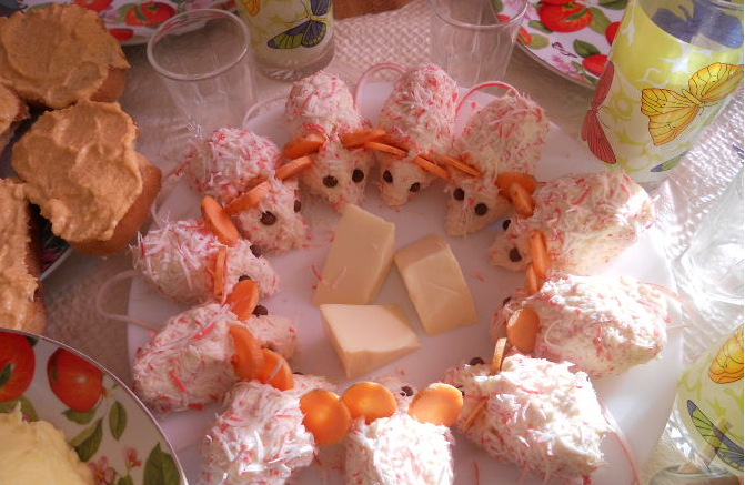Представляю вам очень простое по готовке блюдо на Новый год, но очень уникальное. Называю я его "новогодние мышата". Продукты (на 10 порций): Как приготовить блюдо: 1. Берётся сыр плавленый, трётся на тёрке. Добавляются замороженные тёртые крабовые палочки, майонез, чеснок. Масса ставится в холодильник на 1 час. 2. Формируются мышки, обваливаются в крабовых тёртых палочках, укладываются на блюдо. 3. Глаза - перец горошком, уши - морковка, хвост - крабовые палочки. Для украшения можно положить в серединку кусочки сыра. "Новогодних мышат" охлаждаем и подаем на стол. Вот и всё! Всех с Новым 2020 годом!