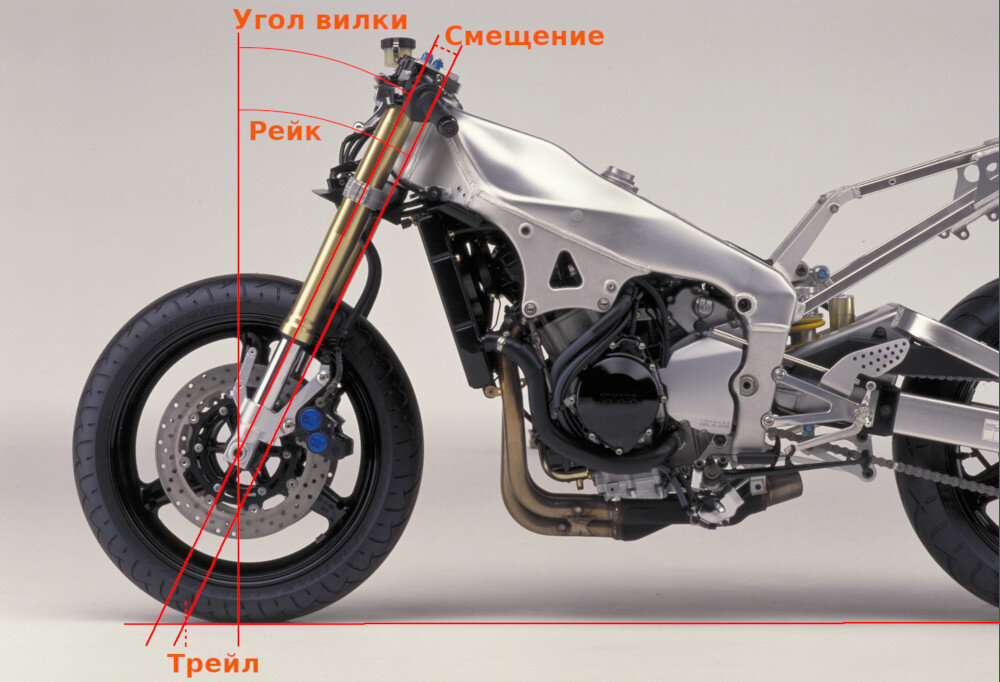 Большой рейк влияет на две вещи: во-первых, это увеличивает колесную базу, и во-вторых, увеличивает трейл мотоцикла.