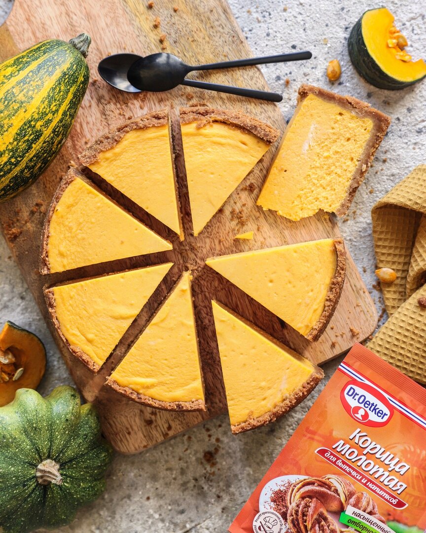 • Кукурузный крахмал Dr. Oetker - 1/2 ст. л. 👉 Способ приготовления: ① Тыкву очищаем, нарезаем кубиком и отвариваем до готовности (мягкости). ② С помощью блендера превращаем тыкву в пюре. ③ Для основы печенье измельчаем в блендере. ④ Добавляем к печенью растопленное сливочное масло и хорошо перемешиваем. ⑤ Кольцо с одной стороны оборачиваем фольгой в несколько слоёв, чтобы защитить от попадания воды. ⑥ Переносим кольцо на ровную поверхность (например доску) и распределяе