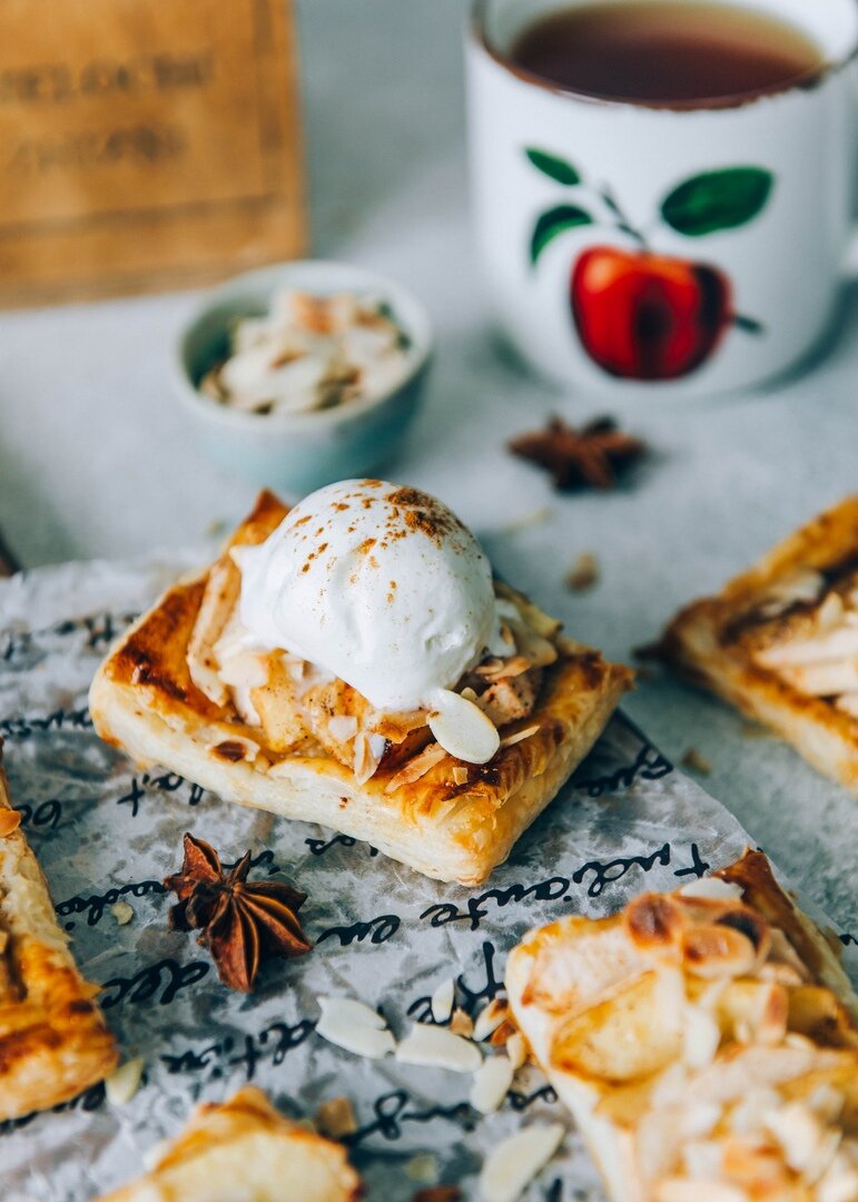 • Желток - 1 шт. 👉 Способ приготовления: ① Пласт слоеного теста размораживаем, раскатываем скалкой и режем на 8 прямоугольников. ② По контуру ножом делаем надрезы, в центре прокалываем вилкой. ③ Перекладываем на пергамент. ④ Смазываем желтком. Выпекаем в заранее разогретой до 180 градусов духовке до золотистого цвета. ⑤ Яблоки очищаем от кожуры, нарезаем на тонкие пластины. ⑥ Засыпаем яблоки ванильным сахаром, корицей и поливаем медом. ⑦ На готовые слойки укладываем яблоки, посыпаем сверху миндальными лепестками. ⑧ Выпекаем еще 10 минут при температуре 200 градусов. ⑨ Готовые слойки поли