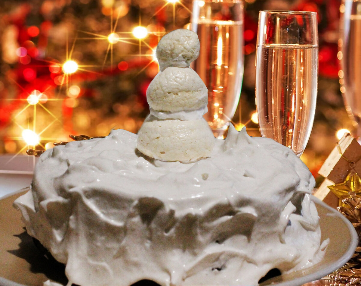 Рождественский кекс хорошо пропитался бренди (см. 3-ий этап), настала долгожданная пора для украшения и подачи на праздничный стол. В оригинальном рецепте кекс украшается с помощью масляного креме, я, однако, решила украсить его более празднично, на мой взгляд, белковым кремом. Для масляного крема вам потребуется: Взбейте размягченное масло с сахарной пудрой миксером до получения пышной светлой массы. Постепенно добавьте бренди, не переставая взбивать. Крем готов, можно украшать рождественский кекс. Для белкового крема вам потребуется: Белки комнатной температуры взбейте до устойчивых пиков. Постепенно добавьте сахар и взбивайте до получения густой массы. Часть получившейся массы я с помощью корнетика выдавила на противень, покрытый пергаментом для приготовления снеговика. Остальной крем намазала на рождественские кексы.