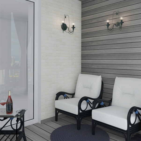 Обшивка деревом. Боковая стена, потолок и пол балкона обшиты одинаковыми досками. В сочетании с белой кирпичной стеной такой интерьер выглядит частью веранды загородного дома. Горизонтальное расположение реек визуально расширяет балкон. Доски не одинаково серые — сделано ли это специально, или так проявилась фактура дерева — в любом случае, эта неоднородность делает помещение объемнее.