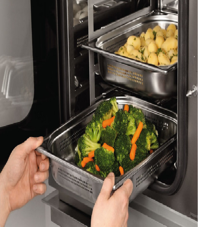 Пароконвектомат - это профессиональный кухонный прибор, который сочетает в себе (помимо прочего) характеристики духовки с горячим воздухом и паровой печи. Таким образом, он может производить как сухое, так и влажное тепло или их комбинацию при разных температурах. Поэтому он подходит для многих видов приготовления пищи, включая выпечку, жарку, гриль, приготовление на пару или бланширование. Среди преимуществ этой технологии - короткое время приготовления и более щадящий способ приготовления, которые приводят к более высокой питательной ценности приготовленных блюд и сохранению большего количества витаминов по сравнению с традиционными способами приготовления.