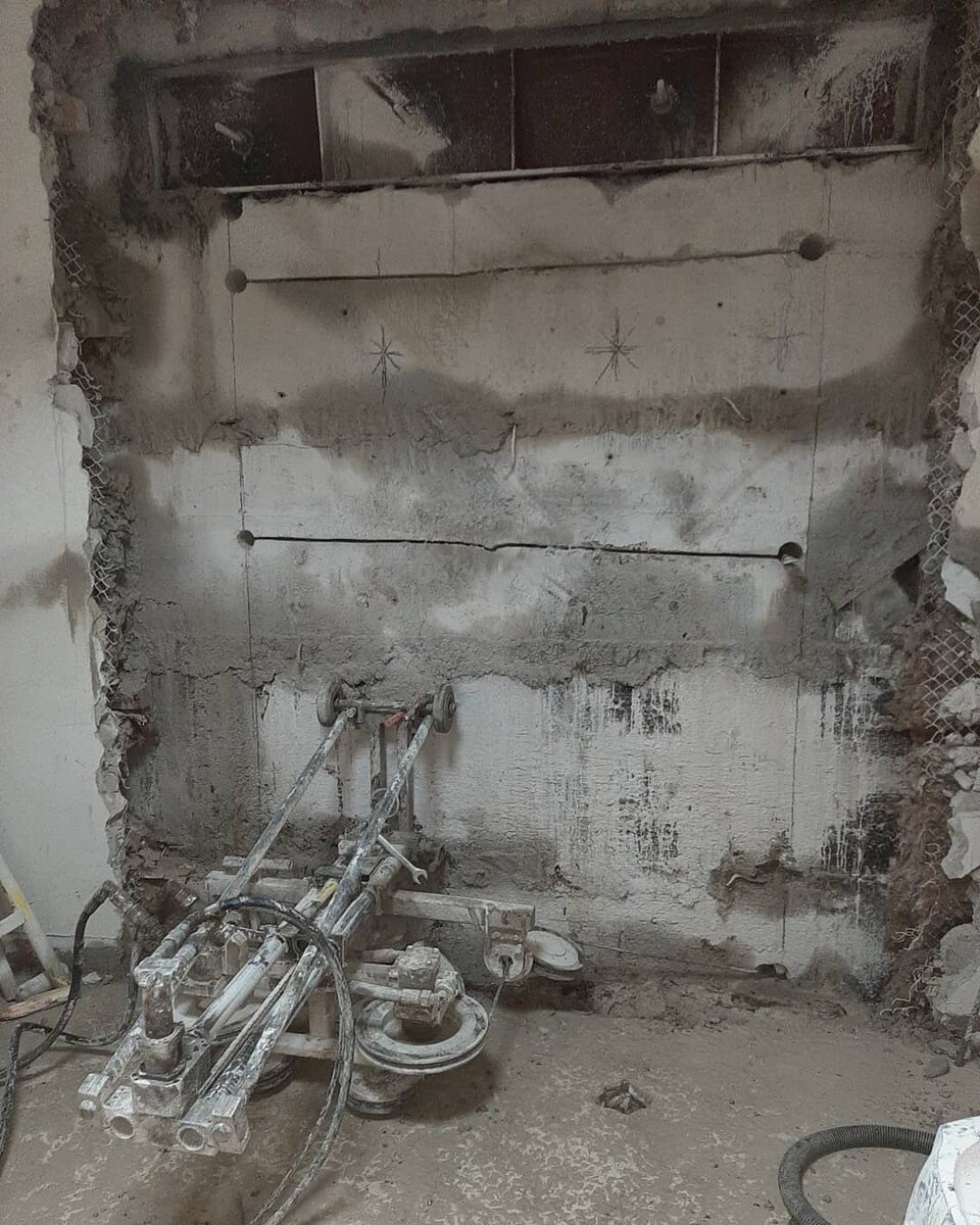 Выбор схемы резки зависит от толщины и состояния стены. Прорезание проема производится на отдельные прямоугольные элементы, вес которых не превышает обычно 50 кг. При этом алмазная резка осуществляется с обеих сторон стены. Полученные блоки вынимают механизировано или вручную, исключая их падение на перекрытие.