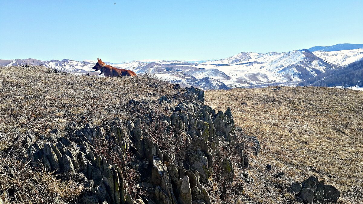 Проводим пса на поводке мимо соседских собак, чтоб не кинулся на них и отпускаем. Довольный пёс срывается с места и просто носится, выкладывает застой энергии. Мы спокойно, не торопясь поднимаемся в горы. Остановились у родника, напиться воды. Рой бегает по кустам, по лесу, нюхает следы, гоняется за мышками, пугает птичек. Но он не охотник, все его попытки выглядят очень смешно. Бегает как маленький, рыжий бегемот, с таким шумом и топотом, что все мышки успевают прятаться в норках, птички упархивают, как только он срывается с места. Но для нашей собаки главное не результат - участие! Поднимаемся на вершину, снежные пейзажи гор изумительной красоты тянутся до горизонта.