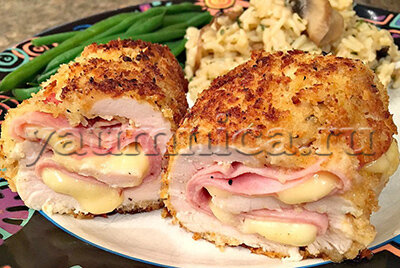 100 г сыра твёрдых сортов. 1. Разрезаем пополам грудки, отбиваем и натираем перцем и солью. Нарезаем ломтиками сыр, а ветчину нарезаем пластинами. 2. Затем на одну половину каждой грудки кладем ветчину и сыр. После чего складываем филе пополам. Обжариваем с двух сторон на сковороде в раскаленном оливковом масле. 3. Готовую закуску выкладываем на блюдо и подаем к столу, дополнив овощами или зеленью. Такое блюдо можно включить и в повседневное меню. Его подают с отварным рисом. Еще один вкусный рецепт - аранчини с мясом. Д