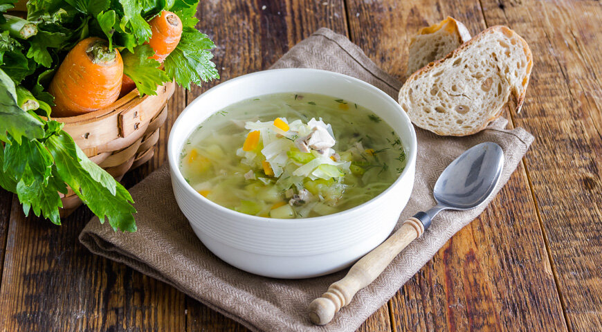 Щи из свежей капусты Мы с вами взрослые люди и понимаем, что, скорее всего, 1 января многим будет сложно. Кто-то переест вкусностей. Кто-то просто не выспится. Кому-то будет плохо потому, что предыдущей ночью было слишком хорошо. Легкий теплый супчик быстро вернёт силы и поставит на ноги Щи у нас не такие жирные, чтобы испортить и без того невеселый день, зато, как нужно, наваристые и слегка кисленькие – приведут вас в чувства. Щи из свежей капусты - диетические в зависимости от бульона, на котором его сварить. Продукты (на 3 порции) Мясной бульон - 0,8-1 литр Капуста молодая 0,3-0,5 кг Картофель - 2-3 шт. Помидор - 1 шт. Морковь - 1 шт. Репчатый лук - 0,5 шт. Чеснок - 1 зубчик Соль - по вкусу Петрушка - по вкусу Укроп -