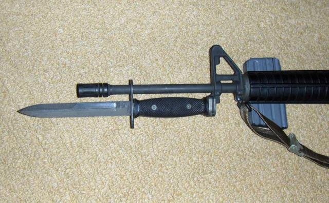 M7 Bayonet Американский штык-нож М7 был разработан в 1964 году для винтовки М16. Он стал одним из последних образцов штык-ножей, в первую очередь являющихся оружием, средством для поражения противника, а не многоцелевым инструментом. У целой серии американских штык-ножей времен Второй мировой войны и послевоенного времени, таких, как например M4 (для карабина М1), М5 (для винтовки М1 Garand), М6 (для винтовки М14) и описываемый тут М7, есть один общий прародитель – боевой нож М3 Trench Knife, широко применявшийся американской армией с начала 1940-х годов и производимый множеством фирм, как в США, так и в других странах. Все перечисленные штык-ножи унаследовали от М3 клинок, отличаясь, фактически, только рукоятями и узлами крепления к оружию. Интересный факт – геометрия клинка М3 позволяет считать его предками нож, делавшийся по заказу немецких люфтваффе, который в свою очередь является лишь одним из многочисленных вариантов «окопных» ножей, появившихся в траншеях Первой мировой войн