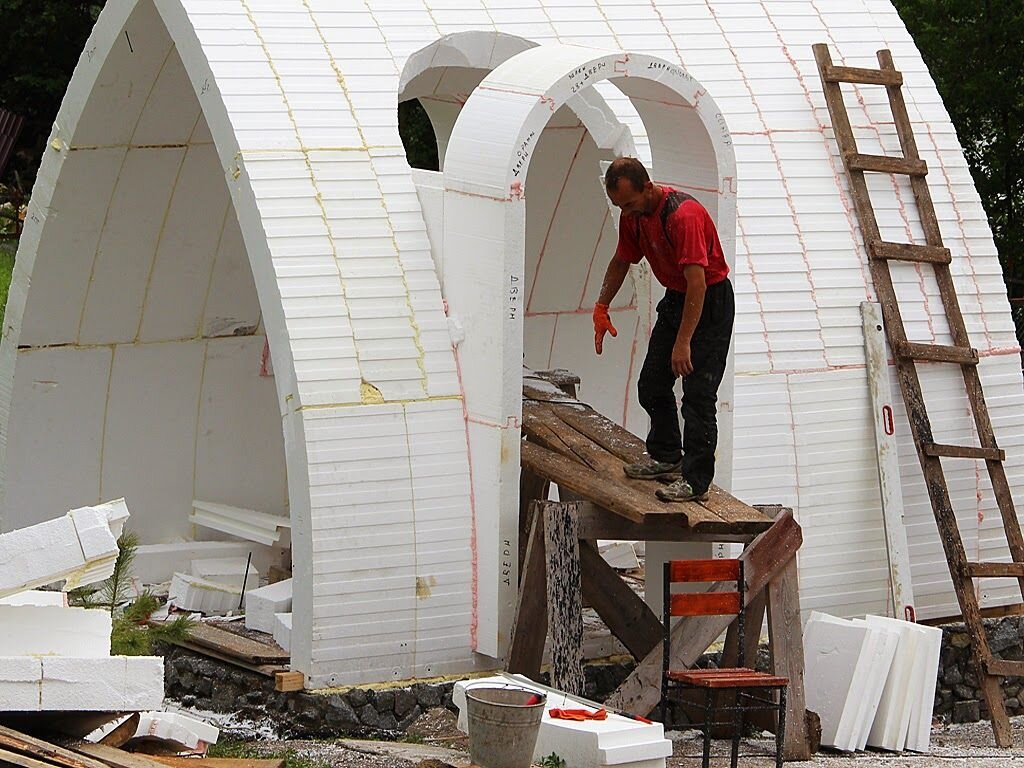 Это не шутка. Есть такая технология - строить, или точнее - клеить дома из пенопласта. Работа предельно простая, по силам практически любому человеку. При наличии прямых рук базовых строительных навыков можно даже сделать красиво.