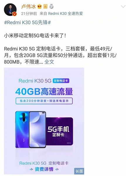 Лу Вейбинг (Lu Weibing), вице-президент Xiaomi Group и лидер Redmi, оставил на своей страничке в социальной сети Weibo важную информацию для покупателей смартфона Redmi K30 5G.