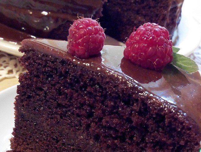 Торт разрезала пополам, промазала ганашем. Затем залила остатками ганаша и украсила малиной и мятой! Наливаем чай, отрезаем кусочек.. Любуемся пористостью бисквита.. Откусываем кусочек...