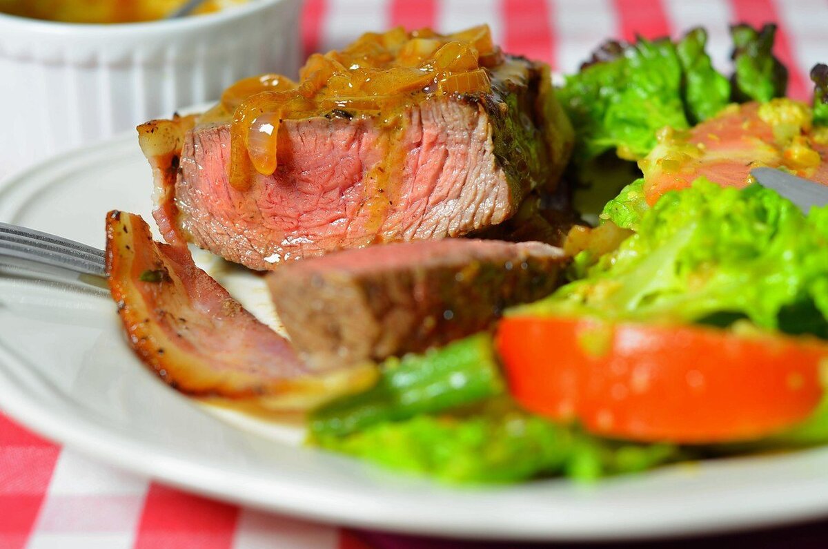 Медальон из говядины Ингредиенты: 3 говяжих медальона, 3-4 полоски бекона, 1 луковица,1 зубчик чеснока, 20 гр сливочного несолёного масла, оливковое масло, соль, чёрный свежемолотый перец,верёвка. Приготовление: 1. Слегка отбиваем кусочки мяса, совсем слегка. Отбиваете для того, чтобы сделать мясо мягким. Когда мясо жарится, внутренние волокна выступают и сокращаются, и мясо становится жестким. Отбивка мяса разбивает вололкна на мелкие части, поэтому, когда они сокращаются, это уже не вызывает нежелательного эффекта. 2. Оборачиваем каждый кусочек полосочкой бекона и фиксируем его верёвкой. 3. Солим, перчим. 4. Хорошо нагреваем сковороду и заливаем в неё небольшое количество оливкового масла. Мясо солим и перчим прямо перед тем, как положить его на сковороду. Выкладываем мясо в сковородку и хорошо прижимаем его, не двигаем! Жарим так примерно 2 минуты. 4. Переворачиваем и жарим с другой стороны тоже около 2х минут. Я люблю мясо средней прожарки, чтобы немного с кровью