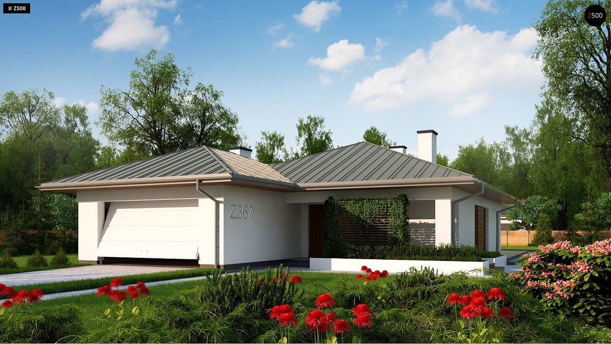 Z367 представляет собой одноэтажный дом с гаражом на две машины и крытой террасой, выполненный в современном стиле. Данный дом актуален абсолютно в любой местности. Преимущества проекта Z367: Наш каталог типовых проектов жилых домов включает множество одноэтажных домов с оригинальной и максимально функциональной планировкой. Для ценителей комфорта и чувства свободы проект Z367 является отличным вариантом. Понравился проект? Пишите комментарии. Посмотреть другие проекты вы можете на сайте.