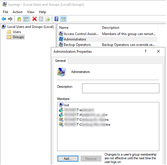 - Откройте оснастку lusrmgr.msc на любом компьютере и проверьте членов локальной группы Adminstrators. В группу должна быть добавлена только группа mskWKSAdmins, все остальные пользователи и группы будут удалены. Список локальных админов можно вывести с помощью команды net localgroup Administrators или net localgroup Администраторы — в русской версии Windows.