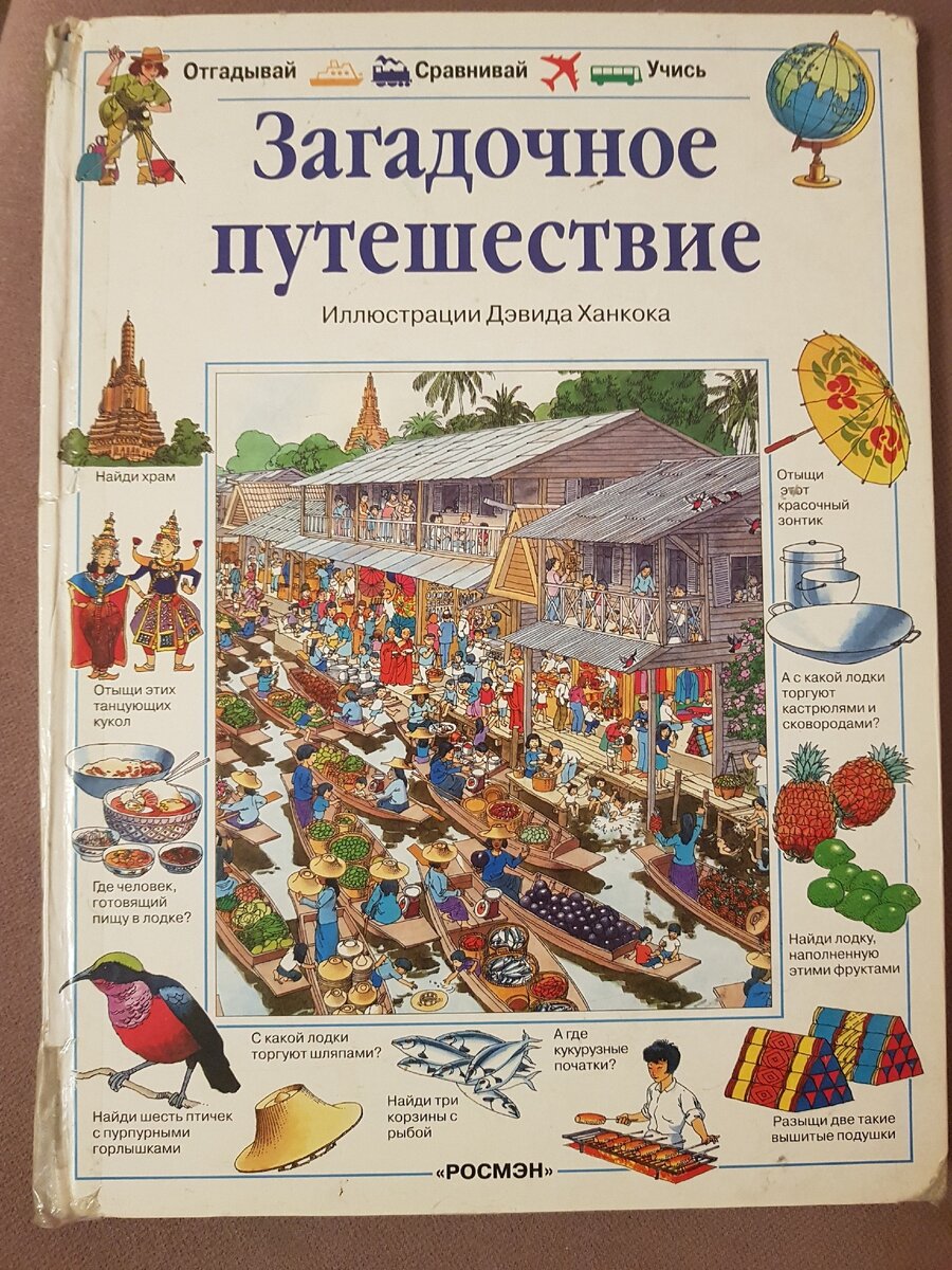 Вы слышали такое слово - виммельбух? Вот и я нет , до того момента пока я не стала мамой. Но при этом и в моем детсве у меня была виммельбух. Но мы тогда и не знали такого слова Wimmelbuch (Wimmelbilderbuch) в переводе с немецкого "книга скрытых объектов ". Появилась она у нас на новый 2000 год . Именно в 2000-ые года в России стали появлятся подобные книги и с каждым годом они становились все более популярны. Но год издательства 1998. Подобный жанр очень любим в Европе , так как "родитель" виммельбуха был немецкий художник. Когда у нас появилась эта книга , мы смотрели на нее ,как на диковинку . Нам непонятно было почему в ней так много картинок и так мало букв . Ведь нас вечно заставляли читать , а мы так не хотели . А это было просто чудо для нас-детей!Книга, которую не надо читать , а надо разглядывать картинки . И это не просто картинки , а загадочная головоломка-путешествие Вот мне кажется именно так нужно обучать детей географии ..лично я многое узнала из этой книги. Путе