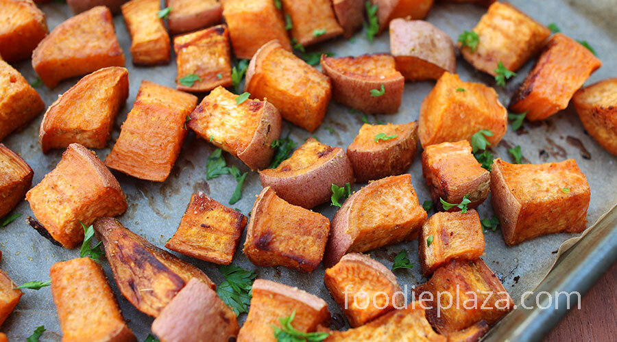 Богатый полезными микроэлементами, запеченный сладкий картофель – это вкусное и питательное дополнение к завтраку, обеду или ужину. Очень универсальное, это блюдо отлично сочетается с овощами, с зерновыми и бобовыми продуктами, с птицей, а также хорошо само по себе. Подавайте запеченный сладкий картофель как гарнир или как самостоятельное блюдо, добавив сметану и зеленый свежий лук, к примеру. В данном рецепте сладкий картофель запекается в кожуре, так как она придает дополнительную текстуру и вкус блюду. Однако, запекать в кожуре или без – это личное предпочтение каждого. Специи для запекания сладкого картофеля – это также величина переменная. Добавьте к нему перец чили и кумин, и у вас получится традиционное блюдо Юго-Западного региона США, отражающего кулинарные традиции Мексики, Испании и коренного индейского населения. Такие травы как орегано, тимьян и розмарин придадут сладкому картофелю средиземноморские нотки. При желании можно и вовсе обойтись базовыми солью и черным молотым п