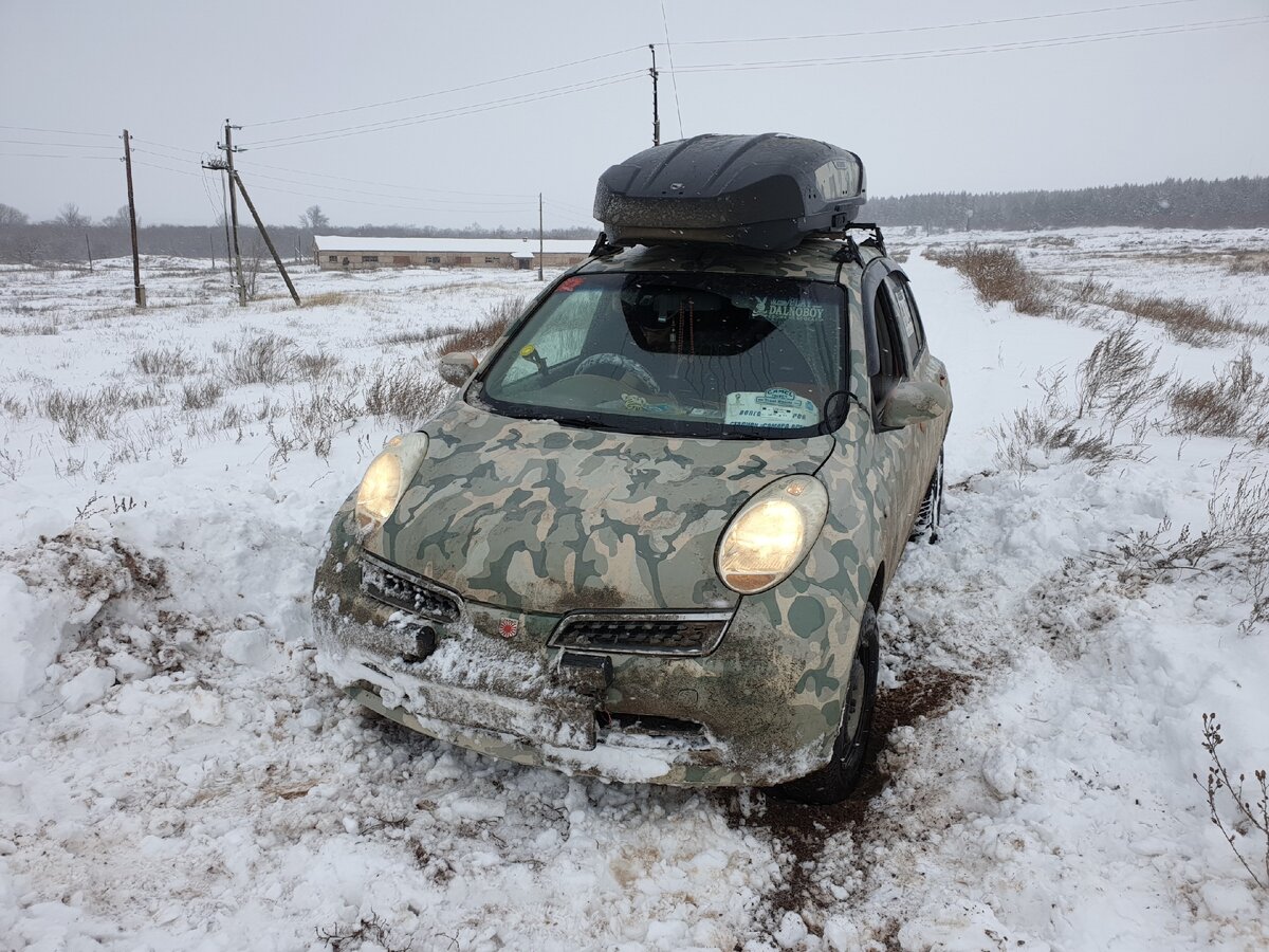 Посмотрев мельницу мы выезжаем в сторону села, точнее начинаем опять пробиваться так как обратную дорогу уже замело, недалеко около леса проезжает мужик на лошади в санях). На улице совсем стемнело и началась пурга. Вышли на трассу. Снег наваливал от души. По пути отказали дворники...совсем весело... быстро чинимся на обочине и едем домой....
