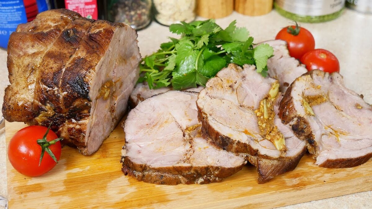Буженина По-французски готовиться из цельного, крупного куска свиной шеи, промаринованного с чесноком и специями не менее 3 х часов, а затем запеченного в духовке целиком.