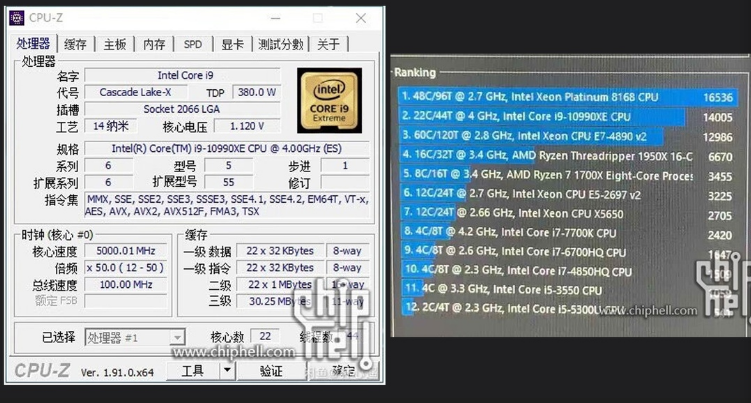 Сейчас потовым процессором для платформы LGA2066 является 18-ядерный i9-10989XE, однако в интернете появились скриншот из CPU-Z и тест в Cinebench R15 22-ядерного i9-10990x. Новинка работает на частотах до 5 ГГц, имеет 30 МБ кэша L3 и слегка обгоняет 24 ядерный AMD Ryzen Threadripper 3960X