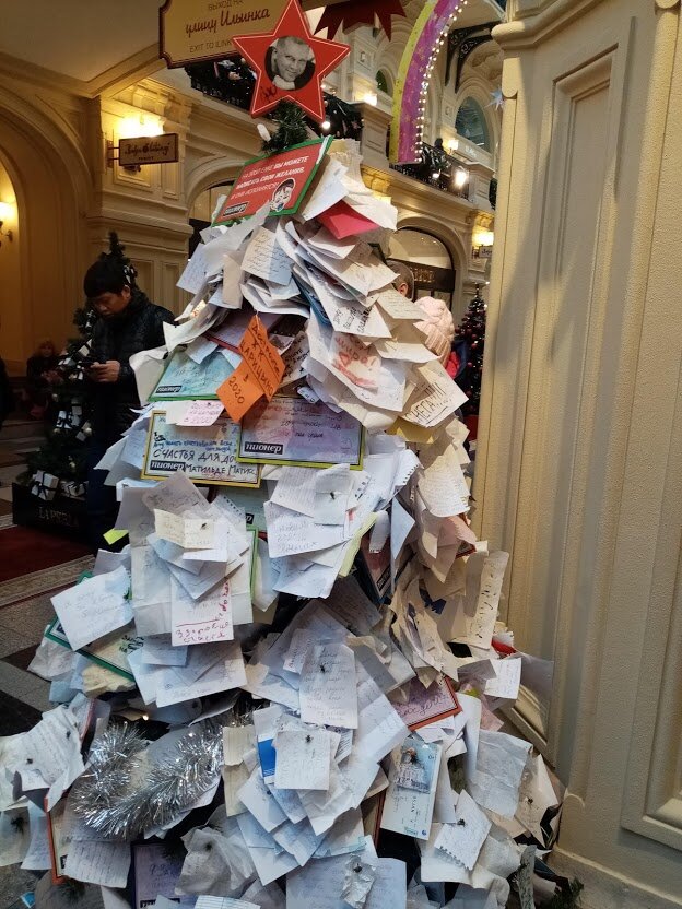 Но вот одна елочка выделялась из всех - так называемая Елка желаний, вся унизанная исписанными бумажными листами разных форматов. Очень любопытно было почитать, чего же хотят россияне.