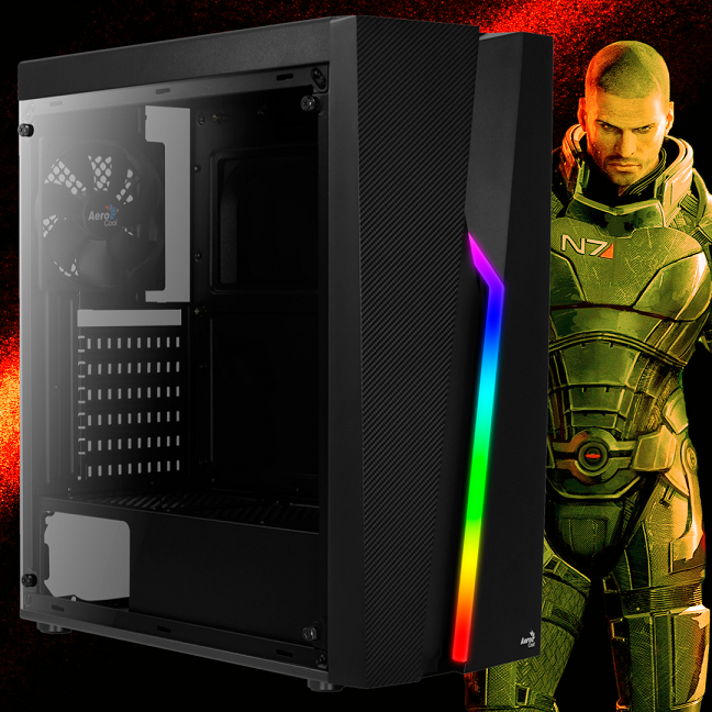 В качестве кейса у нас будет использован компьютерный корпус AeroCool Bolt Black. Симпатичный Midi-Tower с колоритной RGB полоской спереди. Корпус просторный и позволит без проблем разместить все компоненты и организовать качественный кабель-менеджмент. Опционально рекомендуем добавить доп.вентиляцию.