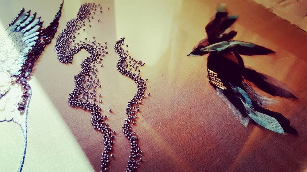 Мастер и преподаватель вышивки Julie Romero закончила и представляет свой образец для дизайнера Высокой моды. Она пишет: «Они спросили, могу ли я сделать их что-нибудь с птицами, и это то, что я разработала и вышила для них. Дизайн был принят, поэтому он будет частью их коллекции 2020 года !!! Я очень люблю цвета и контрасты… Название узора "Vol de nuit ("Ночной полет "), на его создание меня вдохновило творчество модных домов Valentino и Hokusai. Я люблю свою работу, это дает мне столько счастья и полноты для работы с моим сердцем и моими руками!» Julie Romero проходила обучение люневильской вышивке в Школе вышивки Lesage в Париже. Она создает узор нитями, бисером и пайетками. Вышивает на большой раме на шелковой органзе. Тела птиц выполнены из кусочков ткани, оперенье - из полупрозрачной ткани. Волны и облака - из пайеток и стекляруса. Ее птицы кажутся живыми и вот-вот улетят с рамы в ночное небо!