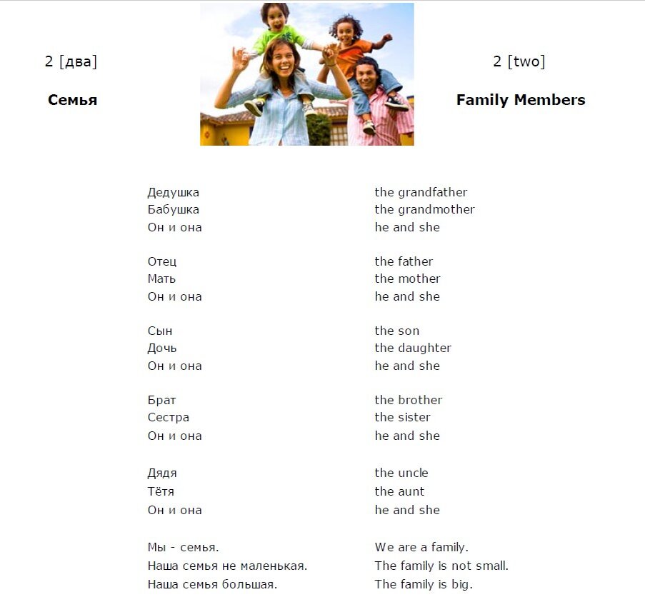 Английский язык. Урок 1. Добрый день! Продолжим изучение английского языка. Английский язык. Урок 2. 2 (два) - 2 (two) Семья - Family Members Дедушка - the grandfather Бабушка - the grandmother Он и она - he and she Отец - the father Мать - the mother Он и она - he and she Сын - the son Дочь - the daughter Он и она - he and she Брат - the brother Сестра - the sister Он и она - he and she Дядя - the uncle Тетя - the aunt Он и она - he and she Мы семья. - We are a family. Наша семья не маленькая. - The family is not small. Наша семья большая. - The family is big. Видео для тренировки произношения: Английский язык. Урок 3.