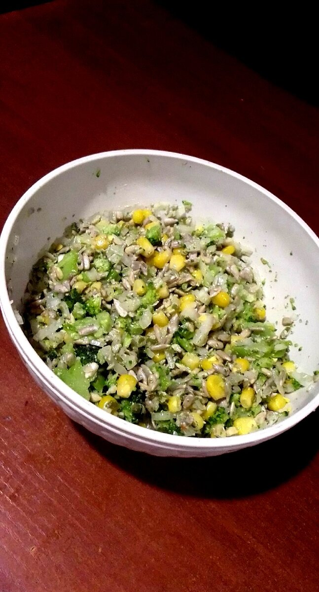Для этого салата нам потребуется: 1. Брокколи. 2. 100гр Семечек. 3. Головка мелко порезанного красного лука. 4. Банка кукурузы. 5. Льняное или другое масло. 6. Перец , соль (по вкусу). Сырую (или свежезамороженную) брокколи порезать мелко на соцветия. Или вместо соли и перца добавьте приправу для салата. Этот салат полезен тем кто увлекается здоровым образом жизни и хочет похудеть. Приятного аппетита;) Так же вам может понравиться рулет из лаваша.
