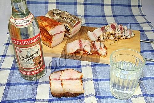 P.S. На первой фотографии позирует антикварная бутылка водки - ей уже более 25 лет. СОСТАВ На 1,5 литровую банку: 700~800г сала, 1 литр воды, 3~4 лавровых листа, 10~15 горошин чёрного перца, 5 горошин душистого перца, 0,5 стакана соли (~150г), 2 зубчика чеснока посмотреть калорийность»