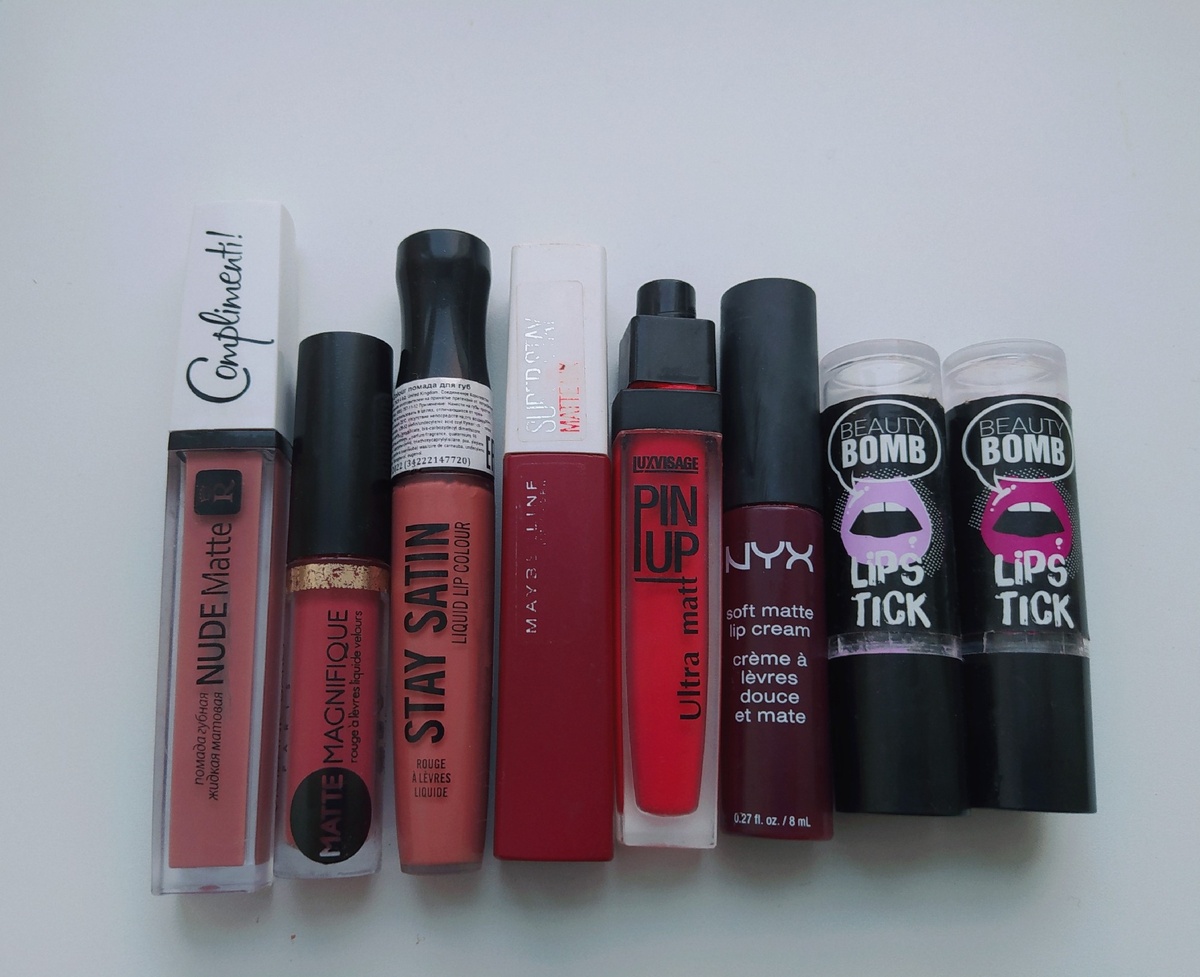 Решила собрать свои бюджетные помады и рассказать о них :) 1. Relouis Жидкая губная помада матовая Nude Matte Complimenti + Быстро застывает и не ощущается на губах + Приятная текстура и запах + Не сушит и не подчеркивает недостатки - Не стойкая, после любого перекуса пропадает с губ Оценка: 7/10 Где купить: Ozon, Wildberries, магазины с белорусской косметикой Цена: ~250 рублей 2. Vivienne Sabo Rouge a Levres Liquide Velours Matte Magnifique + Красивая палитра оттенков + Финиш не наглухо матовый, красиво смотрится на губах + Не сушит, приятно ощущается на губах - Легко смазывается, стойкость на 4/10 - Жидкая, сложно нанести спонжем аккуратно Оценка: 7/10 Где купить: Золотое яблоко, Магнит Косметик, Рив Гош Цена: 150-300 рублей 3. Rimmel STAY SATIN LIQUID LIP COLOUR + Нежный персиковый оттенок + Красиво смотрится, не подчеркивает шелушения - Липкая, неприятно ощущается на губах - Косметическая отдушка - Не выдерживает больше 2-х часов на губах Оценка: 4/10 Где купить: М