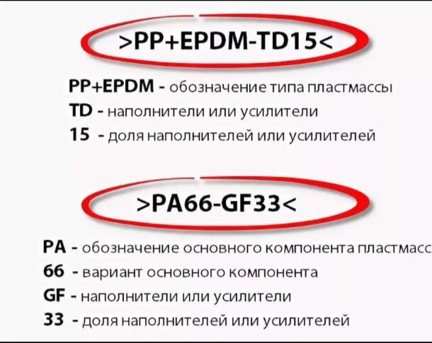 Материал из которого сделана пластмассовая деталь,будь то бампер вашей машины или корпус мобильного телефона, можно определить по маркировки на внутренней поверхности. Как правило маркировка заключена в характерные скобки и может выглядеть следующим образом >PUR< , <ABS>,>PP/EPDM<. При литье деталей автомобиля чаще всего используют не "чистый" полипропилен >PP< а его различные модификации, то есть различные его композиции, смеси с каучуком, резиной. Самый распространённый и известный продукт этих модификаций -> PP/EPDM< Например передние крылья Renault Clio имеют маркировку >PPE+PA66<