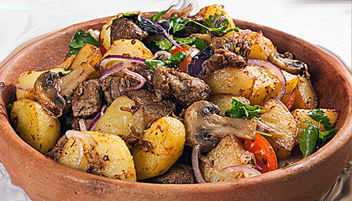 Рецепт этого блюда так прост, что кажется почему мне не пришло это в голову самой. Но, однако, этот рецепт привез мой дядя, которые долгие годы работал в геологической партии в Монголии. Они полюбили его за то, что это блюдо легко приготовить на костре, в нём совсем мало продуктов и все они всегда есть в любой геологической партии. Я готовлю это блюдо в казане, у кого нет казана подойдёт кастрюля с толстым дном, вок или сотейник. К мясу тоже нет особых требований (это может быть баранина, свинина, говядина, индейка, курица, гусь, утка, дичь я делала из кролика с салом – получилось очень вкусно), только берите с жирком. Картофель должен быть величиной со среднее куриное яйцо. Нам понадобится: Мясо – 1,5 кг