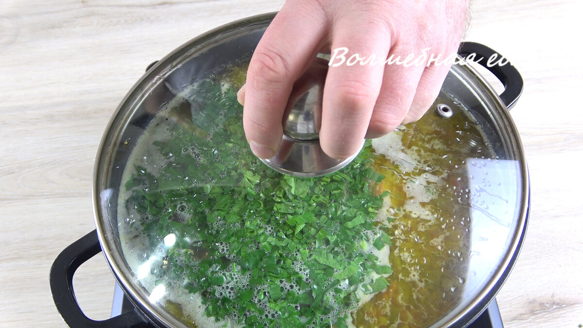 Потом добавляю маслины и зелень. Накрываю крышкой и выключаю плиту. Оставляю настояться минут пять.