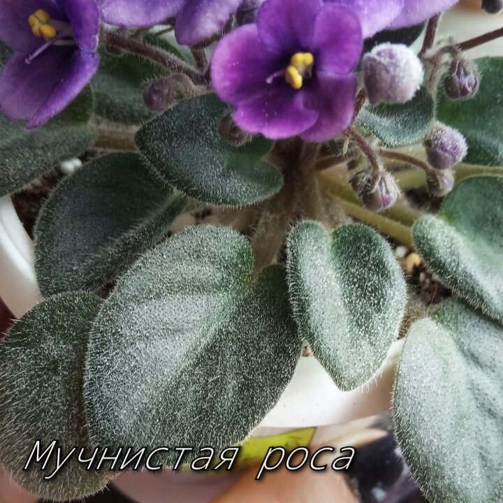 Мучнистая роса – заболевание, вызванное микроскопическими грибами, живущими в почве. Мицелии в виде белого налета паразитируют на листьях, черешках и цветах фиалок. Споры грибка выглядят как коричневые шарики. Они разносятся ветром или каплями воды при поливе. Распознать болезнь можно по серовато-белому налету. В первую очередь он покрывает черешки и листья, расположенные у земли. Дальше распространяется по всему растению. Если подуть на листья, поднимается пыль. Начинающим цветоводом кажется, что розетка грязная. Но после протирания пятна на листьях фиалки не исчезают.