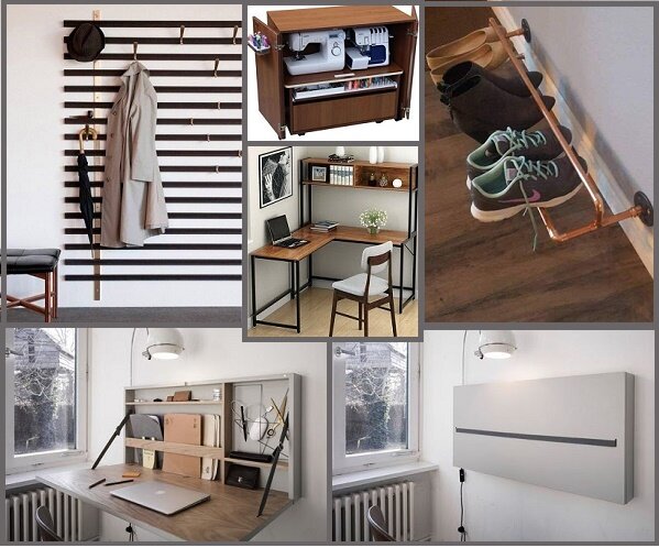 Компактный рабочий уголок, нестандартные варианты хранения крупных и мелких вещей, функциональное задействование мест, которые обычно не рассматривают как возможные. Вашему вниманию 7 интересных идей на эту тему! Швейный уголок Если хозяйка умеет и любит шить, неважно большая квартира или маленькая, ей нужен рабочий уголок. Нижеприведенные фото демонстрируют как обустроить предельно компактное рабочее место. «Компьютерный стол» Если вашим рабочим инструментом является ноутбук, а места для полноценного рабочего стола нет, есть более компактное предложение — настенный стол-трансформер. Как видно на фото, действительно компактное решение, с возможностью складывания и достойным внешним видом. Угловые решения Свободный угол любой комнаты и даже отапливаемой лоджии можно задействовать под обустройство рабочего стола. Представленные конструкции достаточно просты в исполнении, их можно собрать самостоятельно. Кухонный гарнитур Если мебели, составляющей рабочую зону, катастрофически не хватае