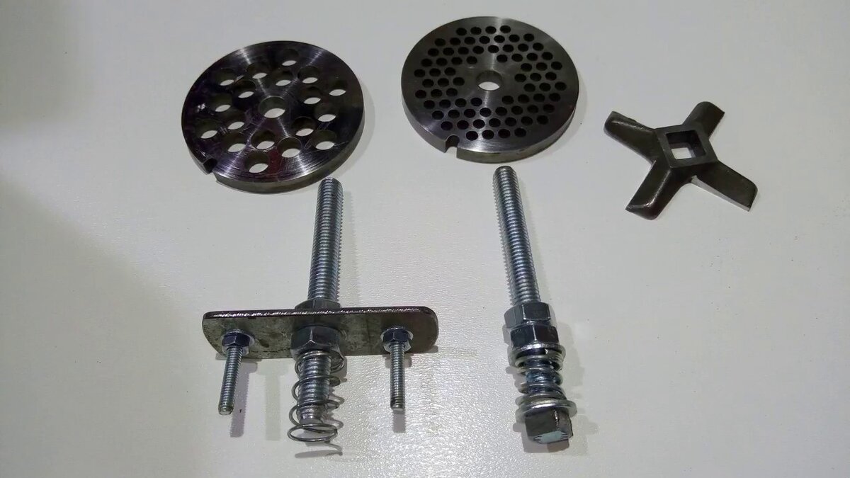 Теперь осталось за малым. Закручиваем болт с пластиной в сверлильный станок. Подкладываем наждачную бумагу. Кладем на бумагу решетку мясорубки, вставляем пружину на центральный болт и вымеряем высоту попуска головки сверлильного станка.