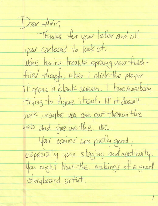 В 1998 году, в возрасте всего 14, начинающий молодой художник Амир Авни решил отправить письмо создателю Рен & Стимпи, Джон Kricfalusi, а также несколько карикатур, которую он начертил, некоторые из которых были относительно неизвестных героев Джона. Невероятно щедрый ответ вскоре прибыла в виде очень комфортно, иллюстрированное письмо показано ниже, наряду с этой картины и книги Престона Блэра. Когда я говорил с Амиром в 2010 году, он сказал об ответе Джона:
