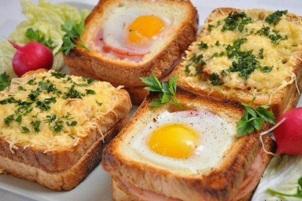 Когда есть время побаловать своих домашних на выходных я всегда готовлю эти чудесные бутербродики . Мои домашние просто в восторге . Попробуйте и вы не пожалеете ! Нам понадобятся : Фарш ( мясной или куриный) - 100 грамм Тестовый хлеб - 8 кусков Сыр - я часто использую несколько видов сыров , например, творожный и обычный Российский. Кетчуп или любой соус по вкусу. Соевый соус - 1,5 столовых ложки Масло сливочное около 15 грамм. Масло для жарки, я всегда жарю на нерафинированном горчичном. Яйцо куриное - 4 штуки. Соль по вкусу. Зелень, я беру сушеный укроп. Как готовить : Разогреваем сковороду с маслом, выкладываем фарш и добавляем в него соевый соус. Кусочком масла смазать 4 штучки хлеба, у остальных выковыриваем сердцевинку. На сковородку выкладываем наши кусочки хлеба , смазанные маслом , мажем кетчупом или другим соусом и кладём тоненький кусочек сыра. Кладём внутрь фарш и сверху разбиваем куриное яйцо. Делать нужно все очень аккуратно, чтобы наше яйцо не вытекло и сохрани