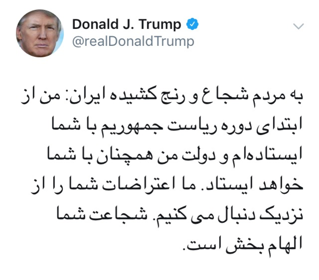 На самом деле нет, вот перевод: «Отважному и страдающему иранскому народу: я поддерживаю вас с самого начала своего президентства, и мое правительство будет продолжать поддерживать вас. Мы внимательно следим за вашими протестами. Ваша смелость вдохновляет»