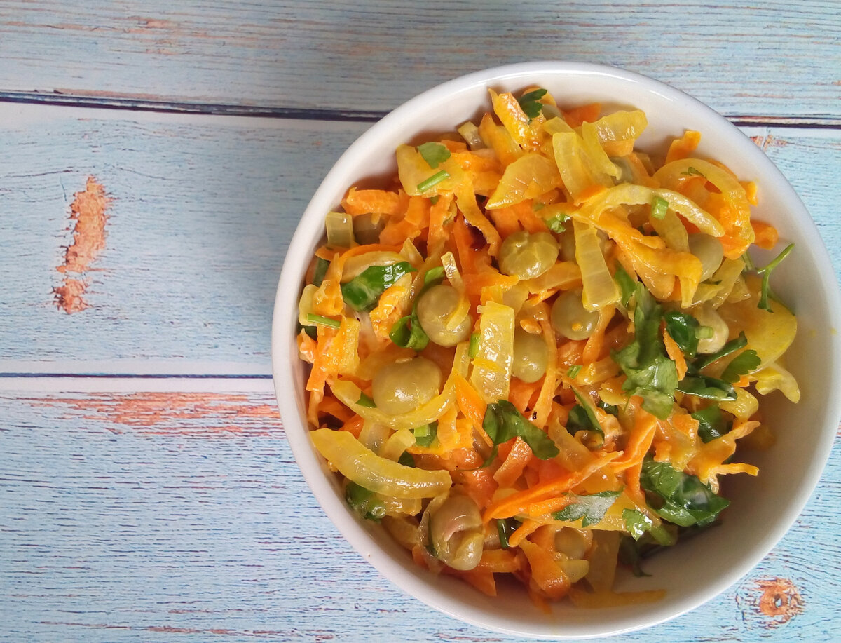 Это блюдо можно подать как салат, а если не заправлять его майонезом, то и как гарнир. А еще без майонеза салат становится постным-вегетарианским. Готовится яркое и вкусное блюдо за считанные минуты, так что если у вас нет времени долго стоять у плиты, попробуйте приготовить такой салат. Порция простого салата без майонеза вполне может заменить ужин, особенно если хочется немного “разгрузиться”. Ингредиенты: Морковь – 2 шт. Лук репчатый – 2-3 шт. Горошек зеленый - 1 банка Петрушка – 1 пуч. Масло растительное – 1 ст.л. Майонез – по вкусу Соль – по вкусу Лук почистим, промоем и нарежем тонкими полукольцами или чертвертинками. Морковь почистим, промоем и перетираем её через крупную тёрку. На разогретом растительном масле обжариваем лук до красивого цвета и мягкости. Добавляем к луку морковь и продолжаем тушить овощи на небольшом огне около 10-ти минут. Постоянно помешиваем. Петрушку промоем, обсушим и измельчим ножом. Петрушка не самая нежная зелень, поэтому можно добавить её в салат ме