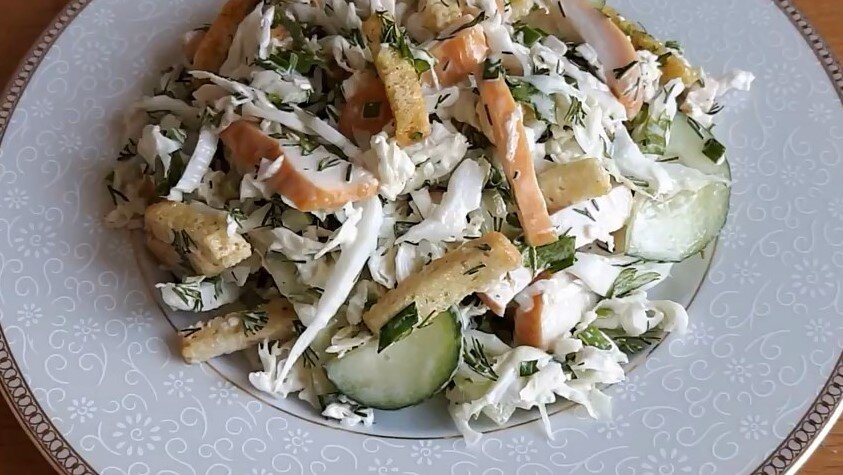 Поэтому однозначно для гастрономического разнообразия в зимний вечерок лучше всего подойдет интересный салатик с пекинской капустой. Ингредиенты: пекинская капуста - 600 гр огурцы - 300 гр копченая куриная грудка - 300 гр майонез - 100 гр подсолнечное масло - 1 ст.л. зелёный лук - 1 п. петрушка - 1 п. укроп - 1 п. сухарики - 140 гр