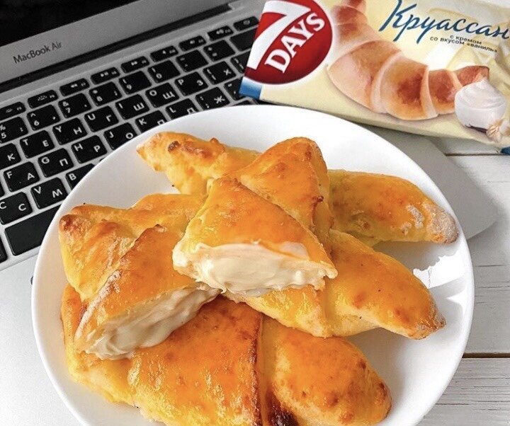 - Раскатываем тесто на хорошо присыпанной мукой поверхности и разрезаем его на треугольники.В каждый треугольник выкладываем крем и сворачивав его в круассан.