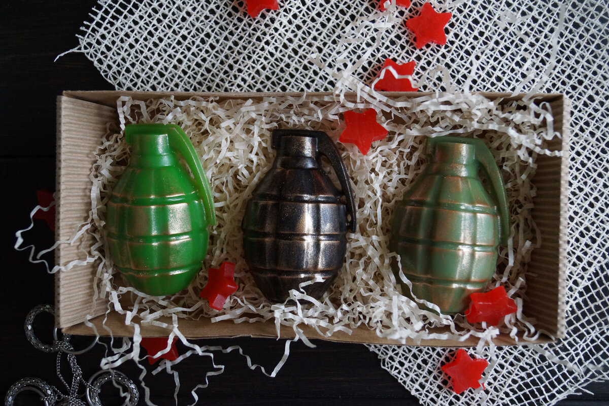 Новогодние праздники позади. И мое мыльно-праздничное настроение переключилось на приближающийся День защитника Отечества. Я долго ломала голову, как сделать мыло по-настоящему брутальным, но при этом красивым и, конечно же, выполняющим свою первостепенную функцию. И вот что у меня получилось. Это не единственное «мужское» мыло в моем арсенале. Про другие расскажу чуть позже. А пока про гранаты (в детстве мы их звали «лимонками»). Чтобы они выглядели не просто однотонными и скучными, пришлось поработать с позолотой. Видите, ощущение, что они металлически поблескивают, а кольцо так просто медью отливает, как настоящее. А сверху, чтобы вся эта красота стала еще красивее – слой перламутра. Ароматы я тоже старалась подобрать такие, чтобы они радовали обоняние сильной половины человечества, но и слабую равнодушной не оставили. А еще мне понравилось, что благодаря своей форме это мыло удобно ложится в руку. В общем, у меня дома начался марафон «воинственного» мыловарения. О его этапах