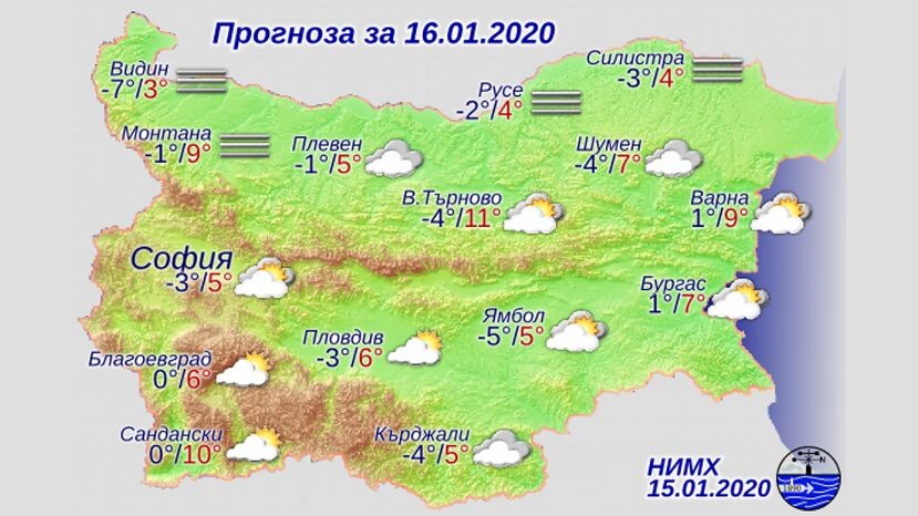 Ночью будет облачно с минимальной температурой между минус 4° и 1°, в Софии – около минус 3°. Днем будет облачно с максимальной температурой между 2° и 7°, в Софии – около 6°... Прогноз погоды в Болгарии на 16 января