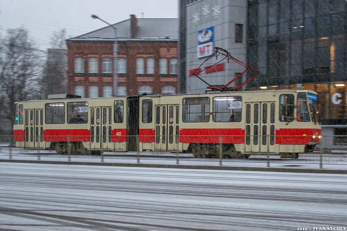 1. В соответствии с тем, что колея узкая, а еще из-за того, что достаточно часто трамваю приходится подниматься в гору и достаточно крутую или идти по достаточно узким улицам Калининграда, подвижной состав здесь используется тоже не самый привычный (на взгляд человека из Москвы, Питера или Тулы) - трамвайные вагоны Tatra KT4D. Вот такие, как на нимке во время снежного заряда - выкрутасы погоды там тоже "визитная карточка".